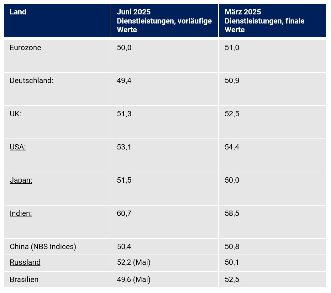 Der Dienstleistungssektor bewegte sich im 2. Quartal 2025 laut Einkaufsmanagerindices in einer Gesamtbetrachtung im Quartalsvergleich ex Deutschland und Brasilien im Wachstumsmodus.