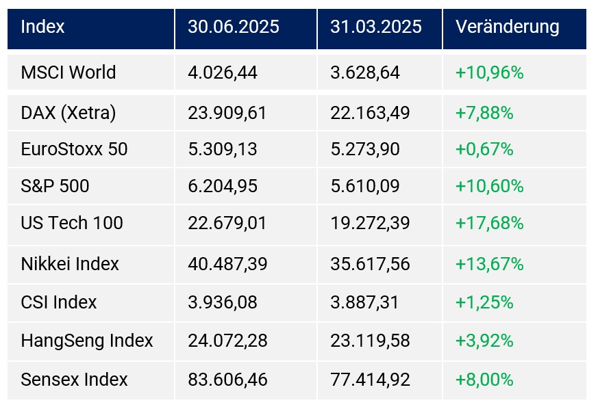 Das 2. Quartal 2025 war gekennzeichnet von Verwerfungen durch die US-Zollpolitik und Geopolitik, allen voran dem fortgesetzten Gaza-Konflikt und den Angriffen seitens Israels und der USA auf den Iran und der zunächst temporären Befriedung dieses Iran, Israel, USA-Konflikts. Der Ukraine-Konflikt setzte sich im 2. Quartal fort, ohne dass ein kurzfristiges Ende des Konflikts erkennbar ist. Das Thema China versus Taiwan stand kaum im Fokus.