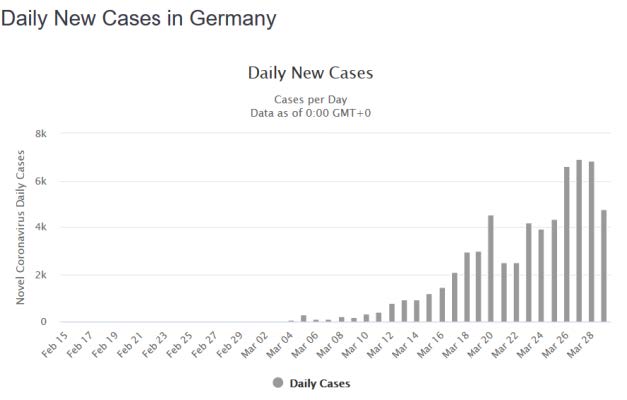 Durch den jetzigen Shutdown sollten die Infektionsraten weltweit deutlich fallen. Diese sehen wir als den wichtigsten inversen Erfolgsfaktor momentan an. In China konnten wir sehen, dass die Aktienmärkte auf die Meldung rückläufiger Infekte positiv reagiert haben. Auf der Webseite Worldometers (https://www.worldometers.info/coronavirus/) kann täglich der Krankenstand überprüft werden. Für Deutschland ergibt sich gegenwärtig folgendes Bild: