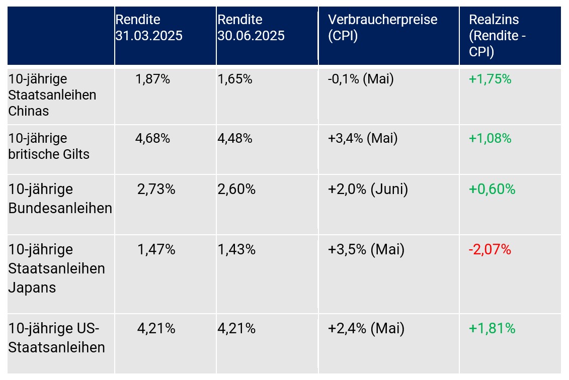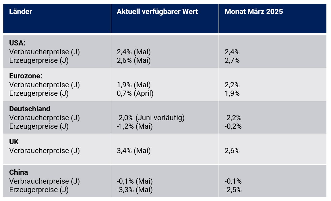 In der Eurozone ergab sich als Konsequenz ein Rückgang der Verbraucherpreise in der Phase von März 2025 bis Mai von 2,2 % auf 1,9 %. In den USA verharrte der Anstieg im Jahresvergleich bei 2,4 %. Großbritannien verzeichnete dagegen von März 2025 bis Mai 2025 einen signifikanten Anstieg von 2,6 % auf 3,4 %. In Japan nahmen die Verbraucherpreise in diesem Zeitfenster von 3,6 % auf 3,5 % ab. Im Verlauf des 2. Quartals 2025 ergab sich in China ein Deflationsszenario mit einem Rückgang der Verbraucherpreise um 0,1 % und einem Rückgang der Erzeugerpreise um 3,3 %.