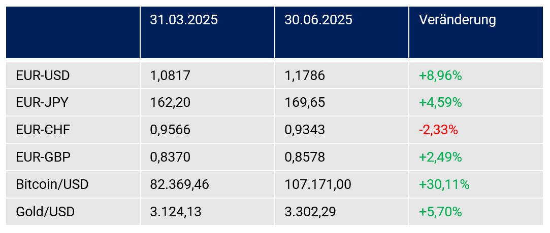 Im 2. Quartal 2025 zerstreuten sich die Ängste, die im März 2025 aufkamen, dass die so genannten „Trump-Trades“ zur Disposition stünden. Aktien und Krypto-Anlagen lieferten eine starke Performance gekoppelt an den Pragmatismus Trumps in den Zollkonflikten. Auch das Thema der US-Leitzinssenkungen wurde zum Ende des 2. Quartals 2025 hoffähiger. Im Raum stehen zwei Zinssenkungen im weiteren Jahresverlauf.